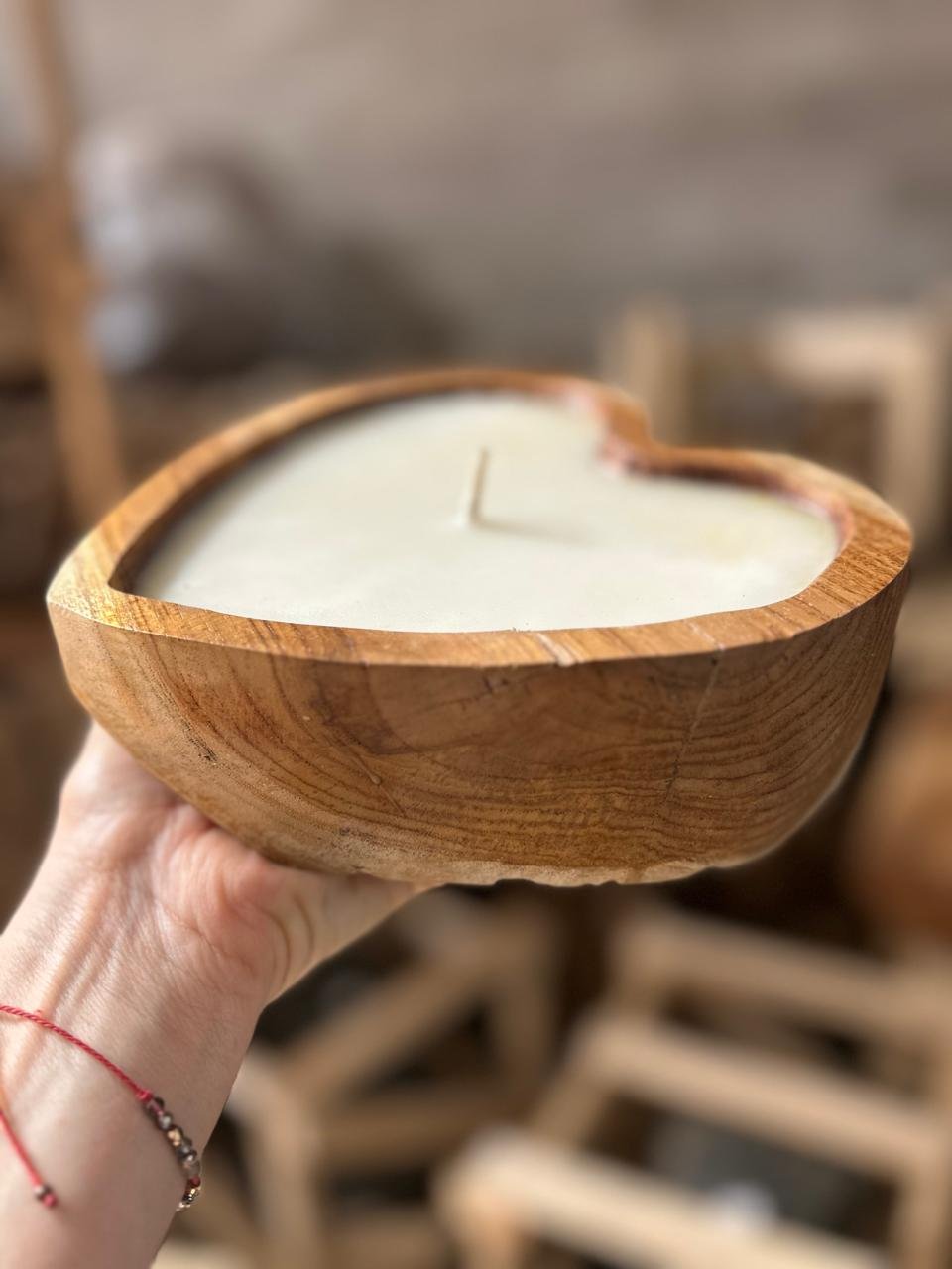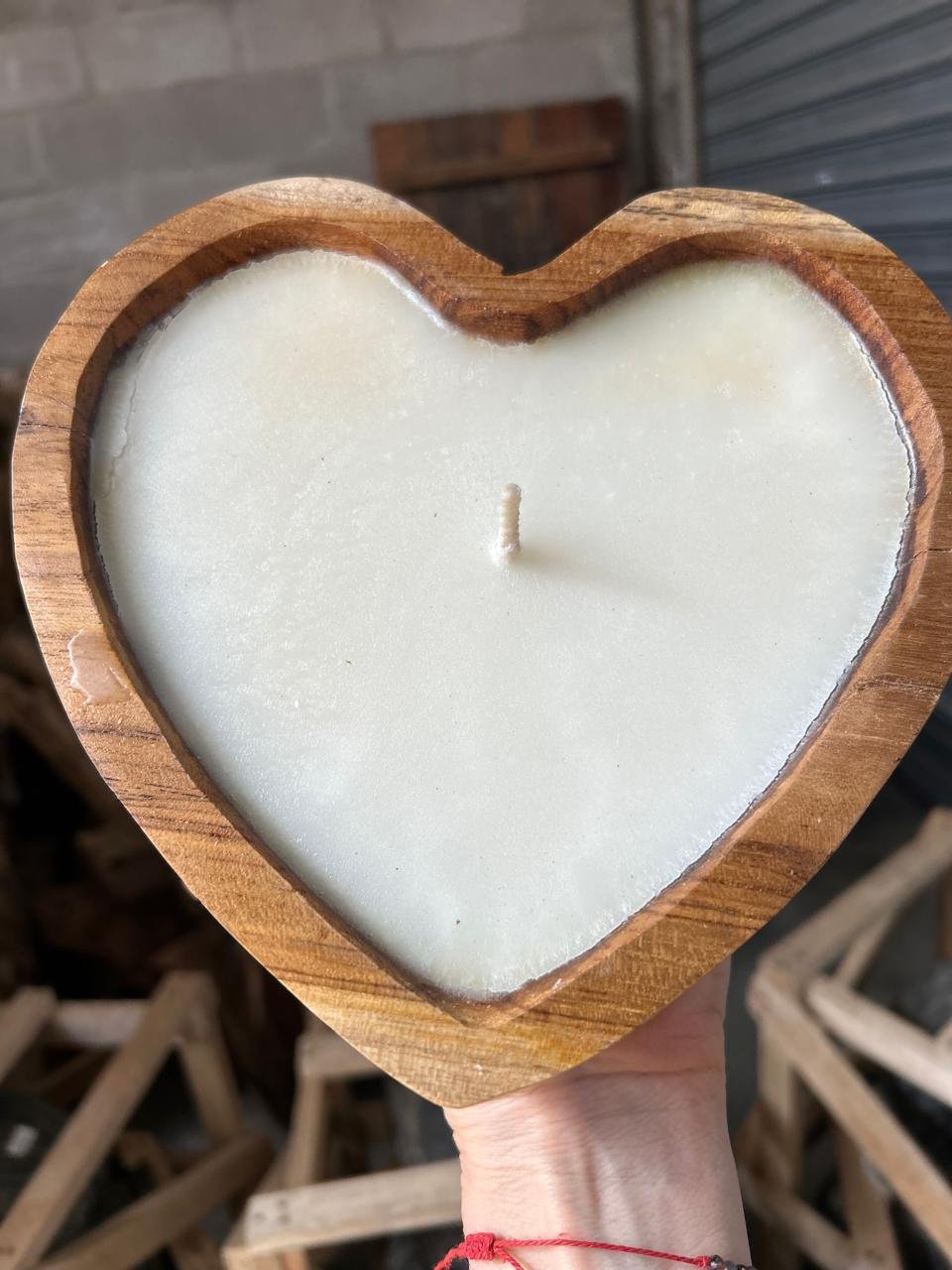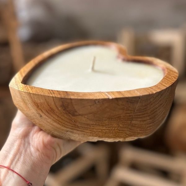 Vela en forma de corazon con base de madera Mahogany de Indonesia.